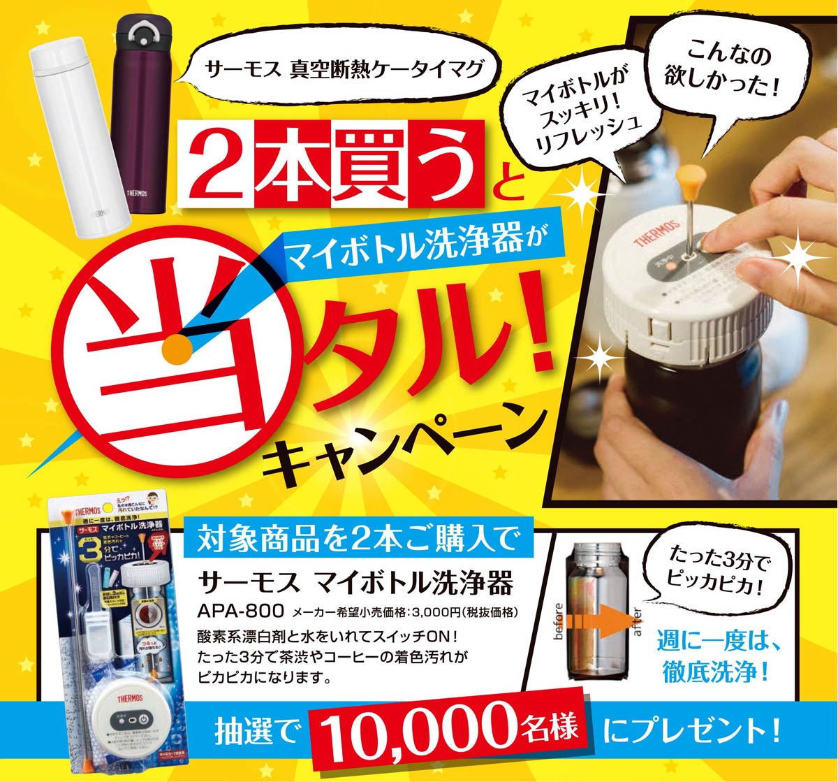 「真空断熱ケータイマグ」を2本購入して応募すると、「サーモス マイボトル洗浄器(APA-800)」が、抽選で10,000名に当たる。キャンペーンサイトと応募はがきのどちらからでも応募はOK。