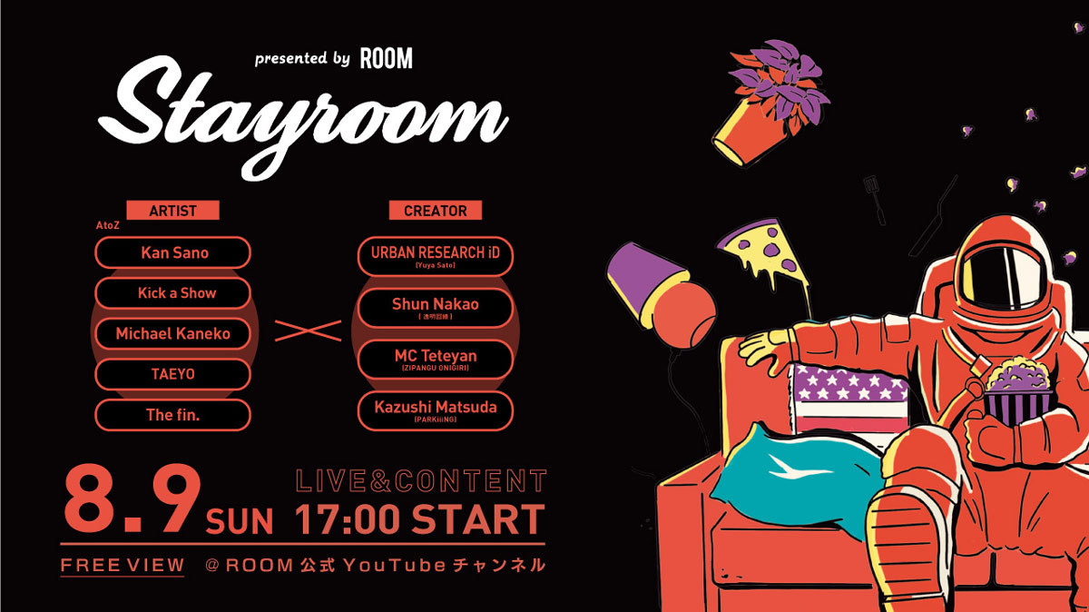 ROOMでは2020年4月より、Instagramのライブ配信機能を活用し、アーティストのInstagramアカウントとROOMオフィシャルアカウントにてコラボレーション配信を行い、トークや質問でアーティストの素顔に迫る番組「STAYROOM」を展開。今回その「STAYROOM」の新企画として、アーティストによるライブパフォーマンスはもちろん、様々なカルチャー・クリエイターと掛け合わせたオンラインならではのコンテンツを織り交ぜた、今までにない新たなオンラインフェス番組をスタートさせます。