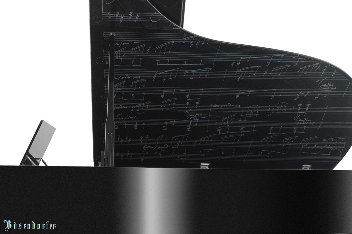 美しく光り輝くマザー・オブ・パール(真珠層)の象嵌によって、譜面台にベートーヴェンの似顔絵が描かれているほか、譜面台の右側部分には「Music is a higher revelation than all wisdom and philosophy.(音楽はあらゆる知恵や哲学よりも高度な啓示である)」というベートーヴェンの名言が施されています。またピアノの側面や鍵盤蓋に記された“Bösendorfer”のロゴも、マザー・オブ・パールの象嵌で仕上げられています。