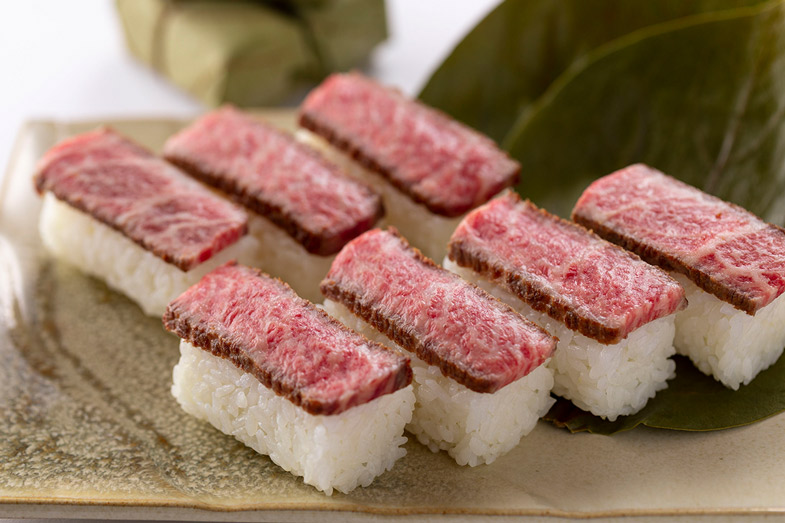 ・高級黒毛和牛を使用した特選 柿の葉肉寿司 7個入 特牛7個 2,462円(税込)