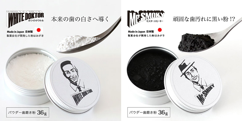 神戸製薬はパウダーが、“強力な研磨力を持ち、磨き残しが一目でわかる”真っ黒な歯磨き粉「ミスタースモーキー」と、歯をケアしながら“白く歯を着色する歯磨き粉”「ホワイトドクトル」を開発。歯ブラシを直接製品につけないように衛生面にも配慮し、「専用の衛生アダプター」を装着。歯ブラシにパウダーを振りかける仕組みにしました。
