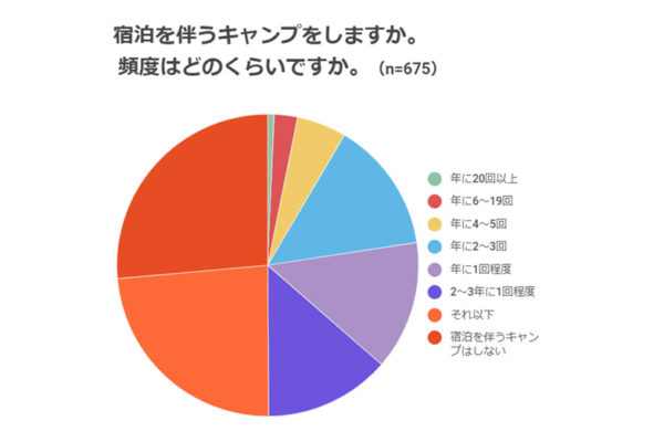 アウトドア歴のある人の宿泊キャンパーは7割、年に1回以上キャンプを割合は3割