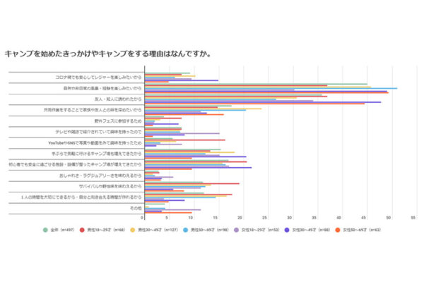 またこの結果を性年代別に見ると大きく特徴が出ており、10~20代の男性は「サバイバルや野性味を味わえるから」と回答をした人が19.1%、30~40代の女性は「コロナ禍でも安心してレジャーを楽しみたいから」が14.8%となりました。