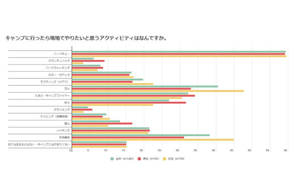 女性では1位が「バーベキュー」、2位が「花火」、3位が「天体観測」と男女でキャンプでの楽しみ方に少し差があることが分かりました。