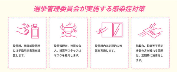 新型コロナ感染症対策として。投票所内は定期的に喚起を実施します。投票管理者、投票立会人、投票所スタッフは飛沫感染防止の為、マスクを着用します。投票記載第、鉛筆等不特定多数の方が触れる箇所は、定期的に消毒をします。投票所、期日前投票所には手指用消毒液を設置します。