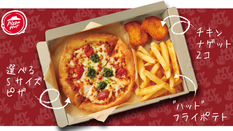 「MY BOX(マイボックス)」は食べきりサイズのSサイズピザとハットフライポテト、チキンナゲットがセットになっており、一人でも色々食べたいといった需要に応えたメニューとなっています。持ち運びにも便利な、セットメニューが一箱に収まる専用のBOXで提供。価格はお持ち帰り700円(税抜)~と、ピザハットのメニューをおひとりさまでも気軽に楽しめるお手頃価格となっています。