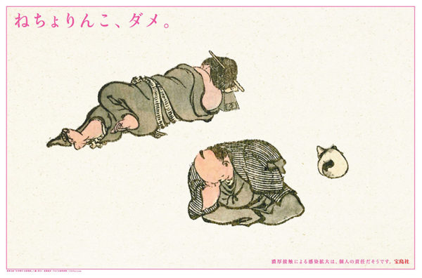 ウイルスの存在におびやかされる毎日。私たち市民の生活は制限され、日常ががらりと変化しました。いったい何をどこまで自粛したら良いのでしょうか。社会的距離をとることを求められるなか、不用意な「濃厚接触」は避ける必要があることを、“ねちょりんこ” という言葉(造語)と北斎漫画で表現しました。指針が定まらず、戸惑い、判断に迷うばかりですが、自粛の先にはどんな未来があるのでしょうか。いま一度、考えるきっかけになることを願います。