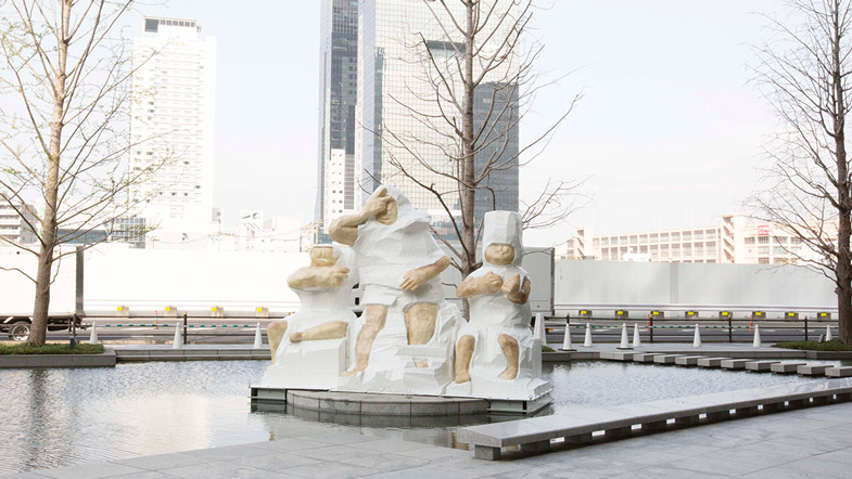 作品説明:「agarma(アガルマ)」はギリシャ語で「彫像」、そして「AGARUMAN」とは「人体彫刻」を意味します。本作は、自身の地元でもある大阪で展示するにあたって、大勢が行き交い、賑わいでいる人々から着想した3体からなる群像彫刻を制作しました。