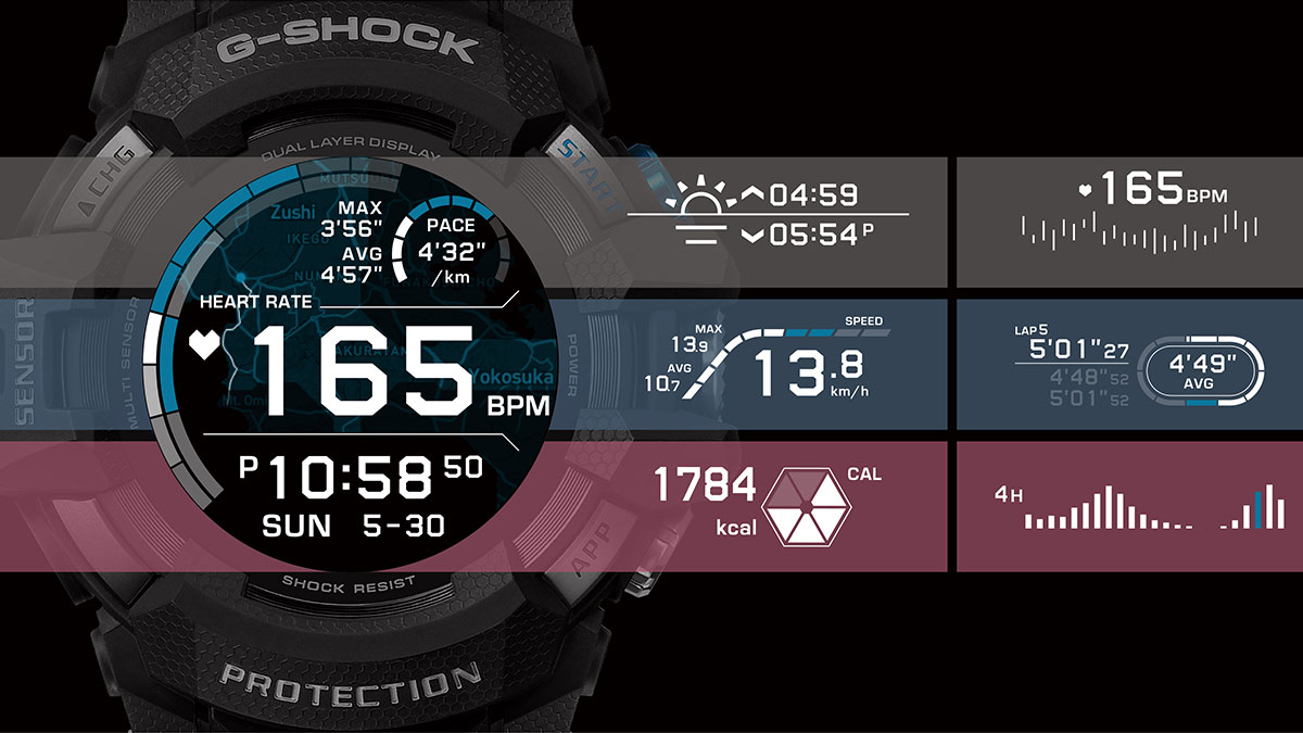 “G-SQUAD PRO”『GSW-H1000』は、耐衝撃性や20気圧防水といった“G-SHOCK”ならではのタフネス性能を備えながらWear OS by Googleを初搭載したスマートウオッチです。スポーツに特化した“G-SQUAD”シリーズの最上位モデルとして、ランニングや屋内ワークアウト、ロードバイク、水泳から、サーフィンやスノーボードなどのエクストリームスポーツまで、幅広いシーンで活躍します。
