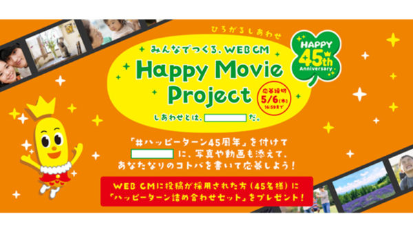 ハッピーターンは45周年。それを記念し「みんなでつくる、WEB CM 『Happy Movie Project』」を企画し、いまの時代にみんなが抱く“しあわせ”を集め(「しあわせとは、◯◯だ。」)、ひとつの動画を作り上げるSNS投稿キャンペーンとして展開。Twitter、Instagramから、「#ハッピーターン45周年」のハッシュタグに乗せて、大切な家族やお気に入りの景色などの写真とともに、思い思いの“しあわせ”が投稿されました。