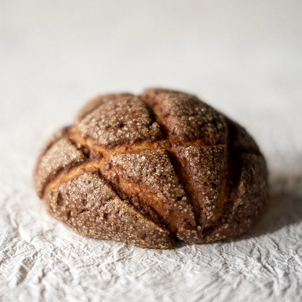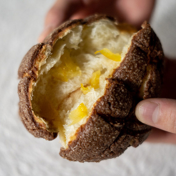 京都の酒酵母を使ったもっちり高加水パンに、香りの華やかな水尾の柚子ピールをたっぷり練り込み、チョコレートクッキー生地を乗せて焼き上げました。