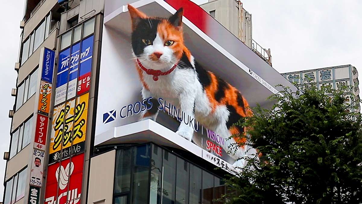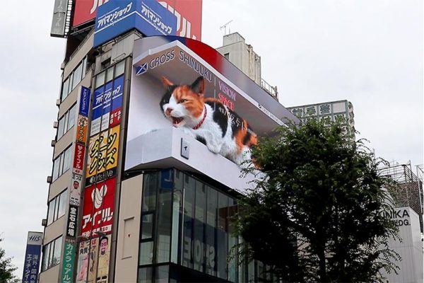 一見、大きなロボット型の猫が設置されたのかと思いきや、新宿駅東口のスクランブル交差点に面した50㎡超級(H8.16m×W18.96m=154.71㎡)で唯一の4K相当対応の大型街頭ビジョンには、ネット上で話題となった巨大猫の3D動画が映し出されています。『クロス新宿ビジョン』の最初の施策となった「巨大3D猫」は、国内外で大きな話題となりました。