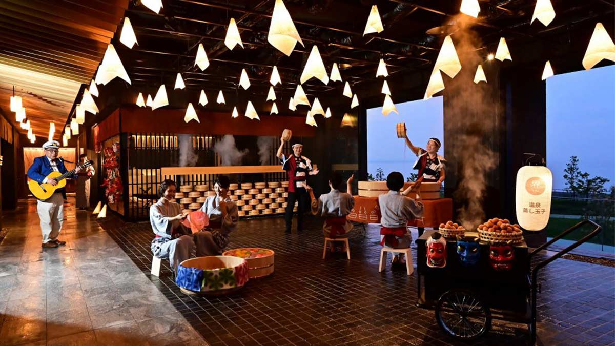 この歴史にちなみ、界 別府のご当地楽は、法被をまとったスタッフが、豊富な温泉と桶から生み出された音色を奏でる「湯治ジャグバンド」です。館内で夜の温泉街の賑わいを演出します。