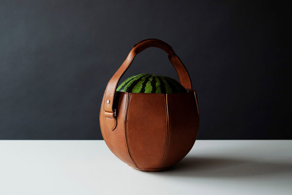 新製品の「スイカバッグ」は、球体の美しいフォルムが特徴です。約60個のパーツを組み合わせ、丸みを帯びた製品に仕上げる、職人技が光る逸品です。大きさは、縦21×横25.0×最大マチ25cmで、L~2Lサイズの大玉のスイカが収まる寸法。素材は、丈夫さと柔軟性に優れたイタリアの高級牛革「バケッタ・ミリングレザー」を贅沢に使用しています。デザインは、真ん丸のスイカの輪郭に沿う美しい球体のフォルムが特徴です。スイカの“頭”がチラリと見える愛くるしい設計で、「運ぶを楽しむ」というコンセプトを具現化しています。カラーは、スイカの鮮やかな緑を引き立てるシックなブラウンです。