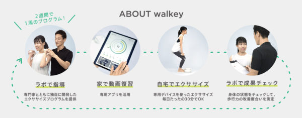 walkeyは、100年歩ける身体を作るための“歩行専用”トレーニングサービス。専用デバイスと専用アプリを用いた自宅でのエクササイズ(1日約30分)と、2週間に1回(60分)のラボでの指導によって、歩く力を鍛えていきます。