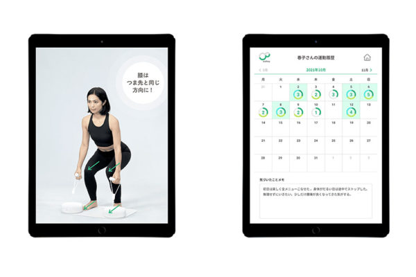 自宅でのエクササイズをサポートするトレーニング動画と、エクササイズのログなどを集約する機能を備えた専用アプリです。画面ごとに最小限の情報をコンパクトにまとめ、ログや操作方法がわかりやすいデザインになっています。使うほどに愛着や喜びを感じてもらえるよう工夫を凝らしており、運動を楽しみながら習慣化ができます。