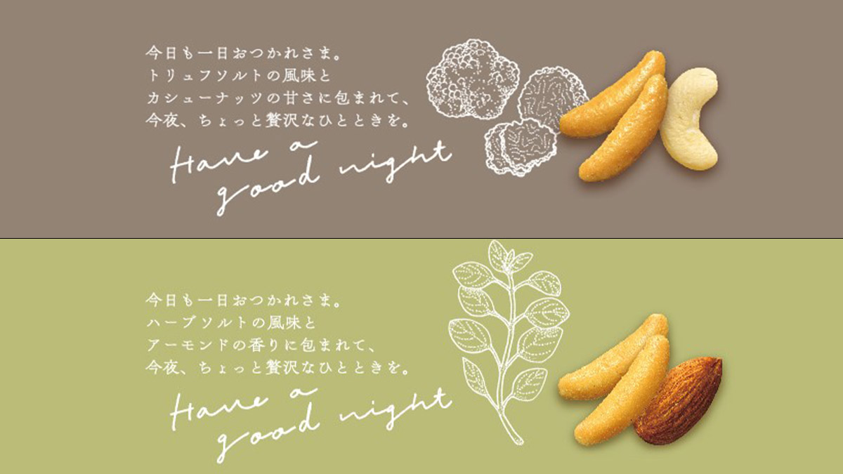 芳醇な香り広がるトリュフソルト味の柿の種と、やさしい甘さのカシューナッツを合わせた『40g 亀田の柿の種 トリュフソルト&カシューナッツ』。やさしく香るハーブソルト味の柿の種と、カリッと香ばしいアーモンドを合わせた『40g 亀田の柿の種 ハーブソルト&アーモンド』。パッケージも通常の柿の種よりも、ちょっと豪華でおしゃれなんですよね。