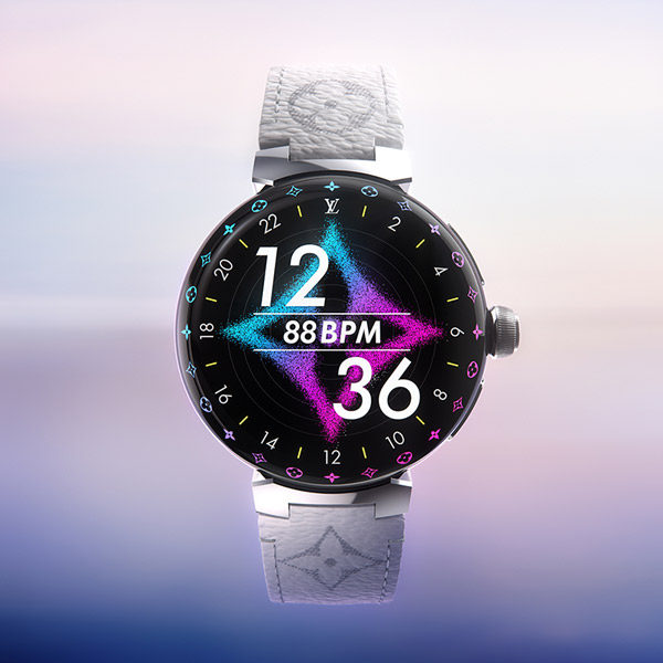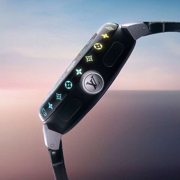 滑らかな時計のエッジの上では、ルイ・ヴィトンのシグネチャーであるモノグラムがデザインされたリングの背後から、24個のLEDライトが明るく照らします。ウォッチの起動時や通知受信時には、まるで万華鏡のようにカラフルに照らし出され、暗闇で光るこの上なく美しく魅惑的なアニメーションを生み出します。