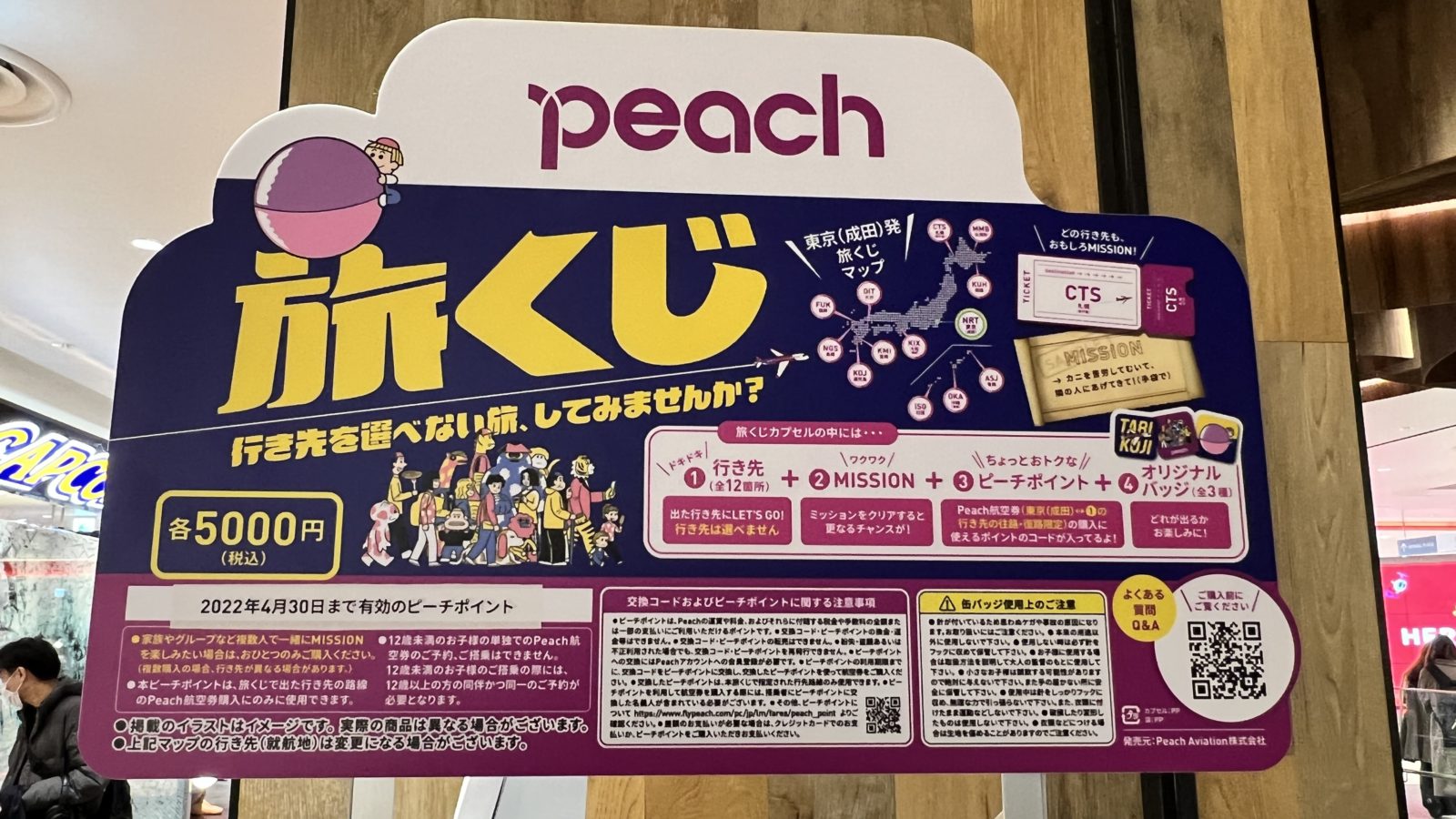 渋谷PARCOをフラフラしていると、6階の任天堂のショップがある階に面白いガチャガチャがあるのを発見しました。「旅くじ」というLCC航空会社のPeachのものでした。