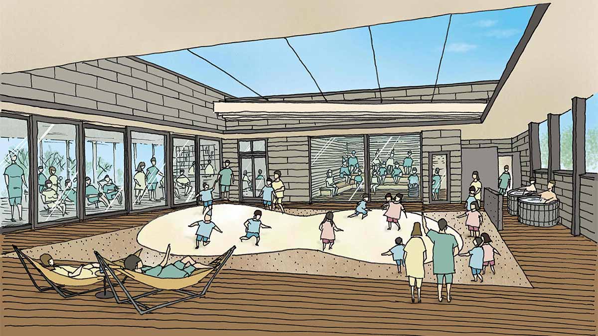 男女、そして大人と子どもが一緒にくつろげるサウナガーデン。水着で入るオートロウリュ付きサウナ室、ととのいを加速する広々テラスの外気浴ゾーンを備えています。テラス中央には「ふわふわドーム」を配置。