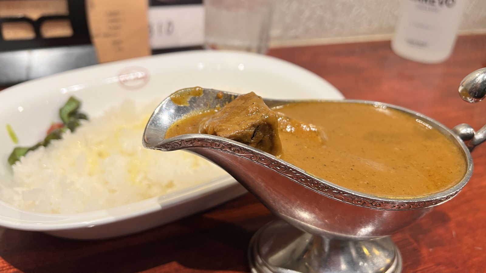 そのあと、カレーがやってきた。来た瞬間に華やかなスパイスの香りに包まれた。ものすごく幸せになれる空間。そしてカレーの中にはごろごろと牛肉が入っていてこれがやわらかい。最初に出てきたじゃがいもを一口大に切って、カレーに付けてもうまい!福神漬けやらっきょと一緒に食べてもうまい!普通の欧風カレーのように食べることができるが、そこにあるカレーのスパイスの香りは濃くいつまでも私を魅了した。