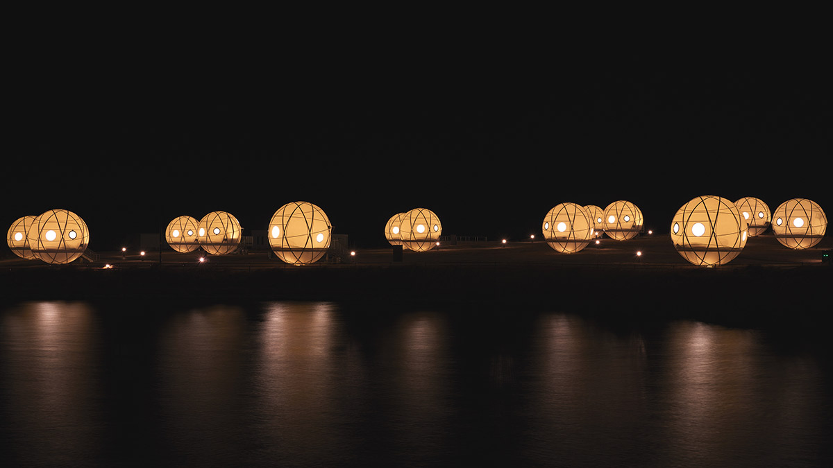沼津でも採用したインザパークのシグネチャー。今回は直径6m。およそ2階建て建物ぐらいの高さのある球体です。突如として公園内に球体が転がっている姿はアートのよう。夜は発光して公園内を彩ります。