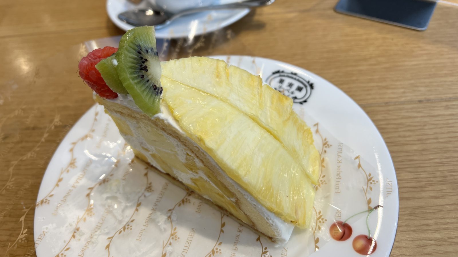 パイナップルは酸味を甘味が絶妙のバランスあり、甘い生クリームによく合います。しかも果実園のケーキは見た目がおもしろい乗せ方になっています。まるでパイナップルの押し花のようなかたちで丈夫にまんべんなく配置されていてパイナップル感が強いです。