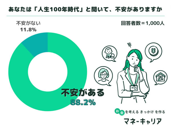 ついに自分ごととして考えなければいけなくなった今、「人生100年時代に不安があるか」を調査したところ、約9割(88.2%)の人が「不安がある」という結果が出ました。