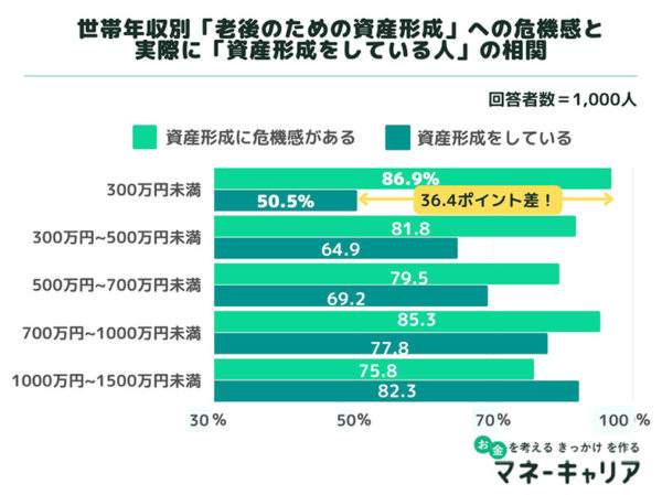 低所得者層の方が「資産形成に危機感がある」割合が高いが、高所得者層の方が「資産形成をしている」割合が高いという結果に。「世帯年収300万円未満」の「資産形成に危機感がある」人の割合と「資産形成をしている」人の割合に関しては、36.4ポイントの差がありました。