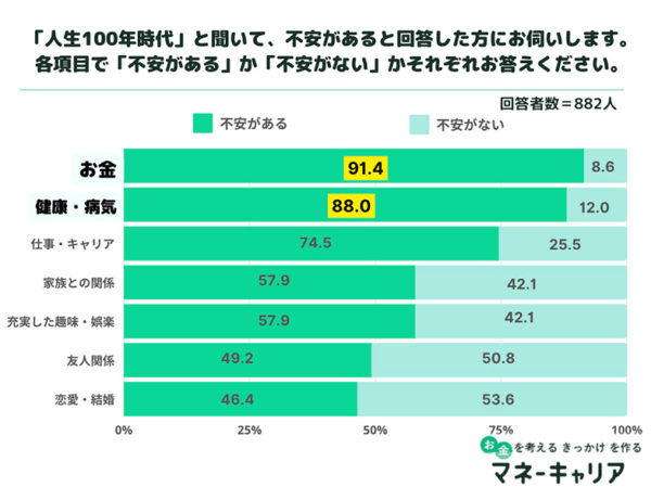 【1】ついに自分ごととして考えなければいけない「人生100年時代」!不安な人は9割!理由トップは”健康”<”お金”という結果に!