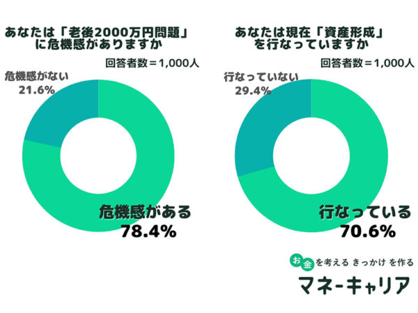 「老後2,000万円問題に危機感があるか」を調査したところ、約8割(78.4%)の人が「危機感がある」と回答。そして危機感があると同時に、資産形成について何らかの行動をしている人が7割以上(70.6%)という結果になりました。