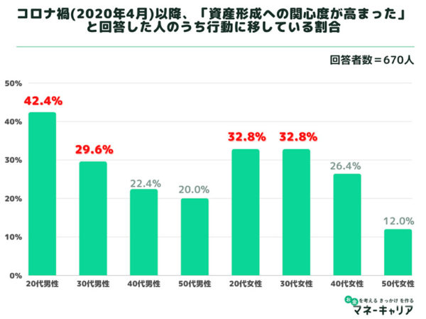 8区分の中で「関心度が高まり、投資などの行動に移せている」のポイントが最も高かったのは「20代男性」の42.4ポイントであり、最もポイントが低かったのは「50代女性」でした。「自分なりの資産形成プランを持っている」と回答した割合が20代・30代が多かったのと同様に、ここでも「コロナ禍以降、投資などの行動に移せている」割合が高いのは20代・30代ということがわかりました。