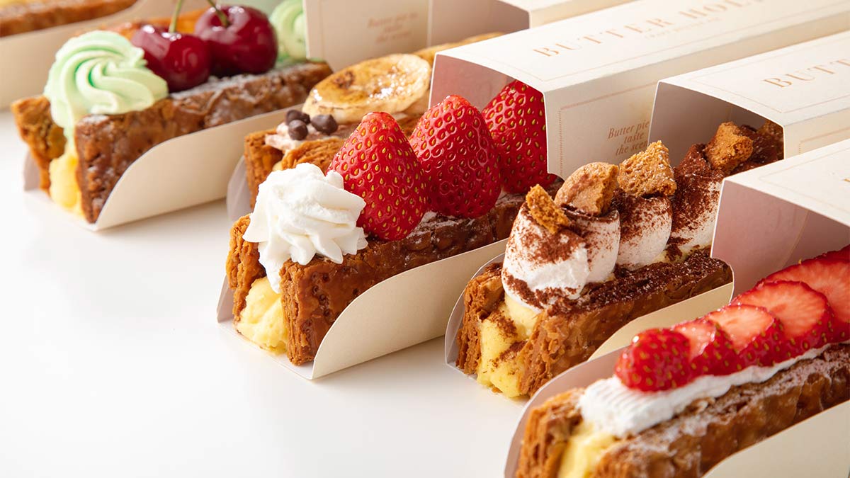 バターパイは1つ1つ箱に入っており、スライドしてパイを取り出すことが可能です。片手で食べることができるよう、パイのサイズやクリームの硬さなど様々な工夫が施されています。そのため、そのままかぶりついての食べ歩きも可能。また、箱に入っているのでお土産にもしやすく、おうち時間のプチ贅沢にもピッタリです。