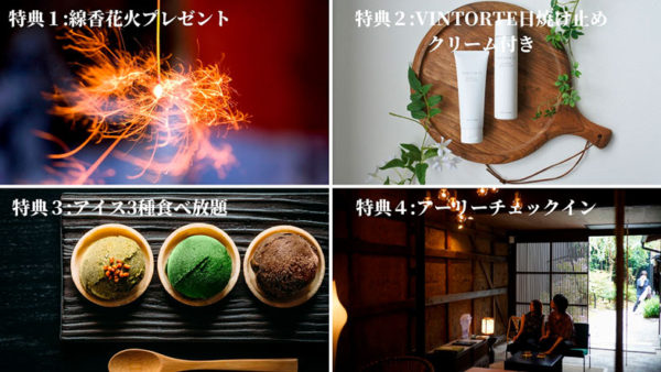 また、散策を楽しみたい方のためにVINTORTEの日焼け止めクリームも準備。散策で疲れたあとも、アーリーチェックインでくつろげます。(特典は宿ごとに異なりますので、詳細は宿ごとのプランをご確認ください)予約可能な期間は、7月22日から8月31日まで。学生の方には特別割引価格プランも。日々の喧騒から離れた贅沢な空間で、ぜひ夏の美しい京都を堪能してみましょう。