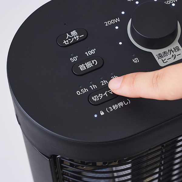 遠赤外線ヒーターのみであたためるエコモードを搭載。エコモード運転時は、本体内部にたまった熱をファンの力で前に押し出し、効率的に温風として再利用するシロカの独自技術「ぬくもりエコプラス」により、あたたかさはそのままに、電気代を節約することができます。さらに、人感センサー付きで無駄な運転を防ぐため、環境にも家計にもやさしく使えます。