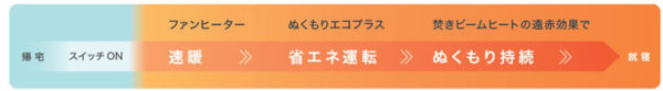 本体内部にたまった熱を温風として再利用する「ぬくもりエコプラス」で節電効果も期待できます。冬の寒い時期でも快適に、環境にも家計にもやさしく製品です。