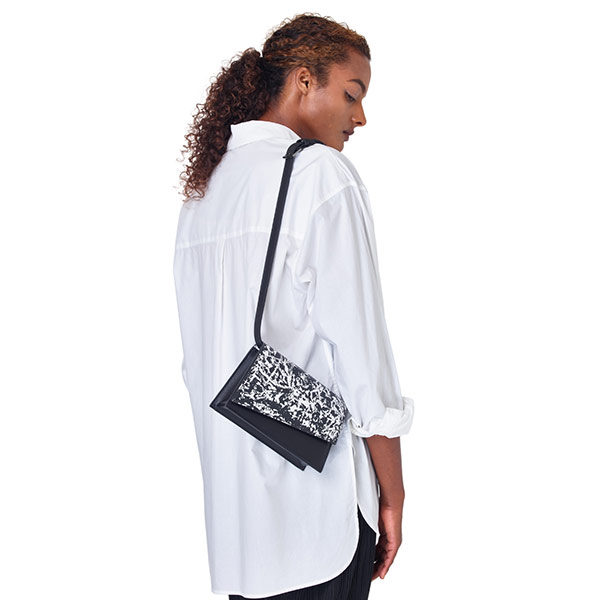 斜めにカットしたフラップは、マグネット開閉で中身の出し入れがスムーズに行えます。肩掛けショルダーバッグとしてはもちろん、たすき掛けをしてクロスボディバッグとしてもスタイリングできるコンパクトなフォルム。ショルダーベルトは長さ調整ができ、フラップ裏にループを通すシンプルな仕様で簡単に取り外すことができます。パーティーシーンにふさわしいクラッチバッグとしてもアレンジが可能です。たすき掛け、肩掛け、手持ちなどオケージョンに合わせて使用できるバッグは、普段のコーディネートをよりスタイリッシュに魅せてくれます。
