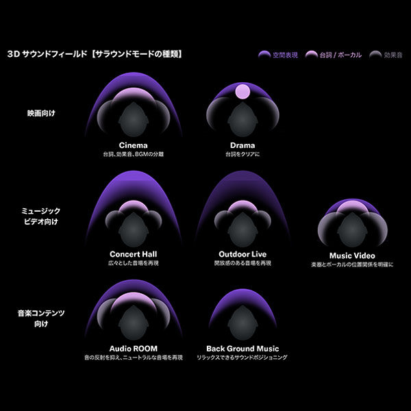 あらゆるコンテンツを3次元音場で再現し、最適な音場で楽しめる「3Dサウンドフィールド」