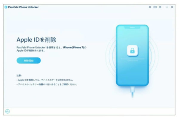 Step1:PassFab iPhone Unlockをパソコンにダウンロードして起動し、「Apple IDを削除」をクリックします。