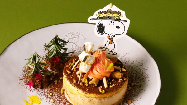 ビーグル・スカウトの「お気に入りの時間」のキャンプファイヤーをイメージしたパンケーキ。火に見立てたチーズクリームや焼きマシュマロなどで焚火を表現しました。ふわふわのパンケーキに紅茶クリームと桃の果肉がマッチした、見た目も味も大満足なデザート。