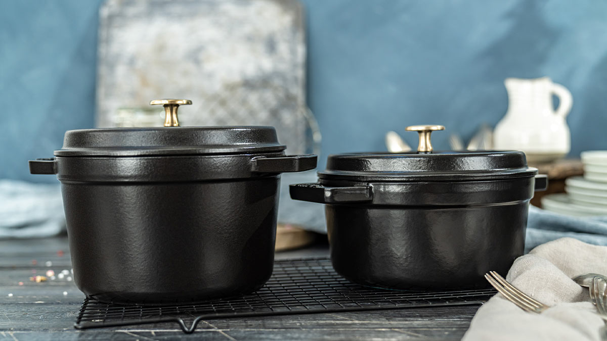 また、鍋の中面はザラっとした黒マット・エマイユ(ほうろう)加工を施しているので、細かな凹凸により食材を香ばしく焼付けることができます。焼いてから煮るという調理が鍋1つでできるほか、焦げ付きも防ぐので調理後のお手入れも簡単です。素材の美味しさ引き出す調理器具を、とのシェフの声により1974年にフランス・アルザス地方で創業、2024年で50周年を迎えるストウブが、現在も三つ星レストランのシェフたちに愛用される所以はここにあります。