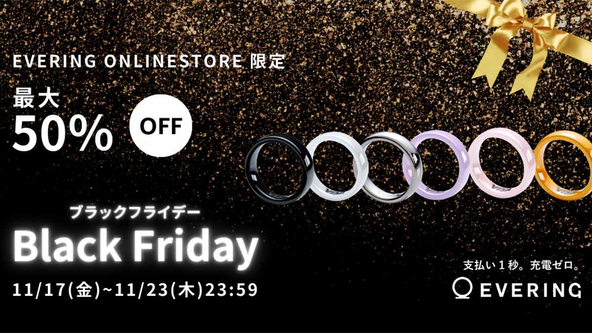2023年11月17日(金)から11月23日(木)の期間、「EVERING ブラックフライデー」を初開催。対象期間中、EVERING全6色がセール対象となり、BLACK / WHITE / SILVERの3色が通常価格の30%OFF、WHITE PURPLE / WHITE PINK / ORANGEの3色*が50%OFFで購入できます。セール対象は、EVERING公式HPで購入した商品のみが対象です。