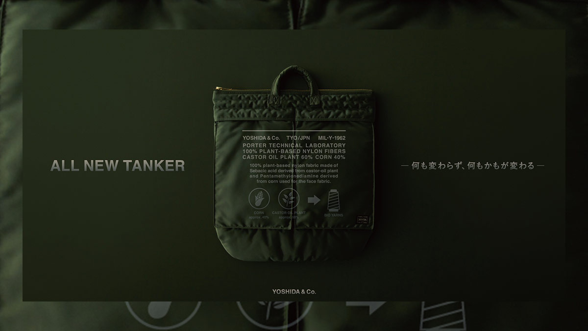 吉田カバンは、この先も、TANKERがTANKERであり続けるためにはどうすべきか?と自問自答し、「ALL NEW TANKER」という答えを導き出しました。そして新しいTANKERは100%植物由来のナイロンに生まれかわります。強く、しなやかで革新的な糸を東レとともに開発し世界で初めて量産化に成功しました。
