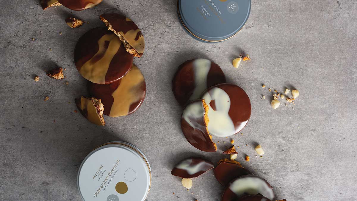 ローストして刻んだものとプラリネペーストといった異なるテクスチャーのマカダミアナッツとキャラメルを練り込みしっかりと焼き上げたサブレ。仕上げにショコラノワールとショコラブランでコーティング。
