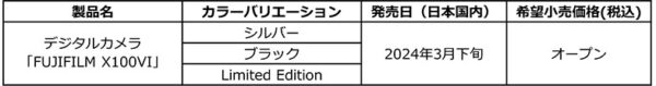 「X100VI」は、細部まで徹底的にこだわったデザインや操作性、卓越した高画質を実現する優れた機能が融合したデジタルカメラで、プロ写真家から写真愛好家まで幅広いユーザーに、カメラを所有する悦びや写真撮影の素晴らしさを提供します。