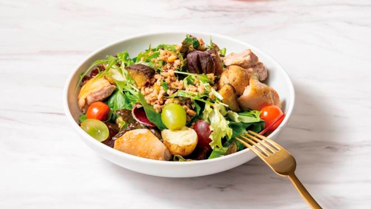 アンチョビバターでローストしたジャガイモとさつまいも、キヌア・グレインズに、ローストチキンを添えた、葡萄とカカオバルサミコドレッシングの風味が爽やかな、食べ応えのあるサラダ。