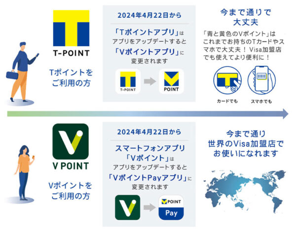 T ポイント・V ポイントは「V ポイント」に名称とロゴを変更。これに伴い、T ポイントおよび V ポイントは自動的に「V ポイント」に変わります。なお、これまで貯められていた T ポイントや V ポイントは、これまで通り「Vポイント」として 1 ポイント=1 円分として利用できます。