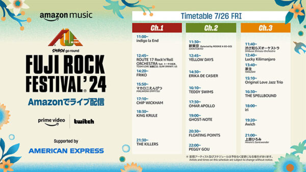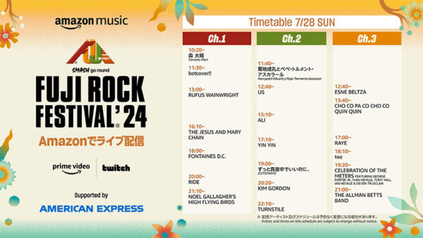 Amazon Musicが、オフィシャルサポーターとして参画し、世界同時にPrime VideoとTwitchにて野外ロック・フェスティバル『FUJI ROCK FESTIVAL ‘24』(主催:SMASH)のアーティストパフォーマンスを無料で独占生配信します。