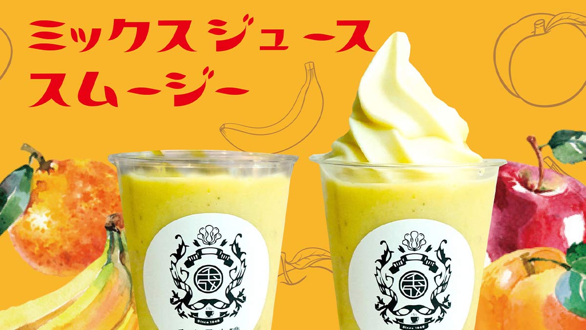 この夏、『千成屋珈琲 本店』よりさっぱり爽やかに楽しめるスムージー食感に仕上げたミックスジューススムージーがテイクアウト限定で新登場します!自然な甘さのりんごやバナナ、ジューシーな黄桃と白桃、爽やかな酸味のみかんの果実をまるごと使い、氷と一緒にミックスしシャリシャリとした食感と濃厚な味わいが楽しめる『ミックスジューススムージー』。