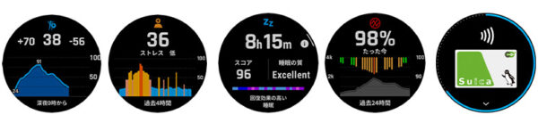 内蔵センサー:光学式心拍計(第5世代)、ABCセンサー(方位・気圧・高度)、温度計、加速度計、ジャイロセンサー